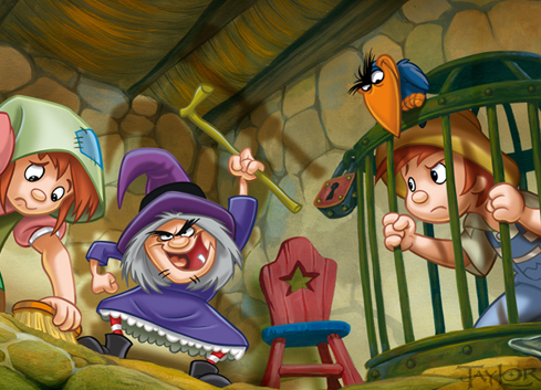 Pasó el tiempo y la bruja finalmente se aburrió, por lo que decidió comérselo así mismo. Le ordenó a Gretel que prepara el horno para cocinarlo. Mientras la bruja estaba distraída viendo si el horno estaba lo suficientemente caliente, Gretel aprovechó la oportunidad para empujarla a su interior.